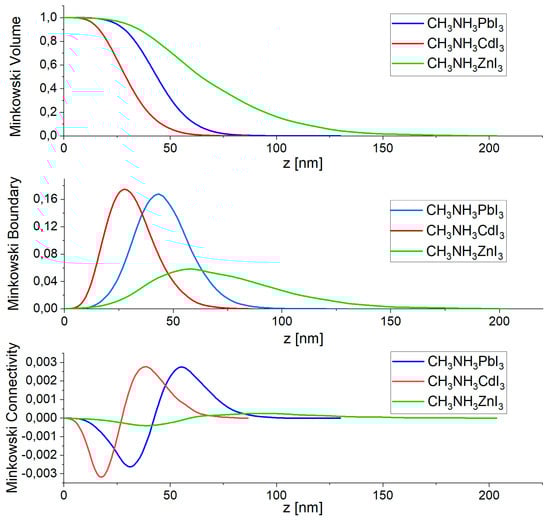 The detailed surface topography of selected perovskite thin films was studied by contact mode AFM. The tested samples were deposited on glass substrates. The obtained images were analyzed using the Gwyddion software and the Minkowski Functional method. The 3D images of the analyzed thin-film structures are shown in Figure 7, and the graphical results of the Minkowski Functional analysis are shown in Figure 8. Table 4 shows the average height of the crystallites forming the layer and its average roughness calculated based on surface topography images. The analyzed thin-film surfaces are 10 µm × 10 µm. All the tested thin layers are characterized by almost uniform coverage of the entire tested surface. Single deviations in the coverage regularity can be seen in the form of single slightly higher (in the case of CH3NH3CdI3) or lower crystallites (in the case of CH3NH3ZnI3). The most uniform structure has a thin layer of perovskite CH3NH3CdI3, which is confirmed by the lowest value of the average roughness. The most important from the point of view of application and subsequent measurements is the fact that the entire tested surface is covered with a thin layer of material. The nature of the obtained thin-film structures is reflected in the results of the Minkowski Functional analysis. The MV characteristics have a smooth shape, which proves that the formation of thin layers in the process of co-deposition proceeds harmoniously over the entire surface. The formed crystallites have the form of sharper needles for the CH3NH3PbI3 perovskite and the form of mild structures in the case of CH3NH3ZnI3. The MC characteristic, in turn, reveals the nature of the created layer—the negative part of the graph refers to its porosity, and the positive part to its islandness. Moreover, the maximum of this characteristic is equivalent to the maximum density of islands and the minimum to the maximum density of valleys in the layer.