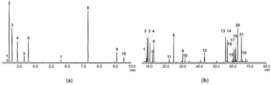 The components of plant material (A. sibirica resin) were studied by gas chromatography–mass spectrometry. A. sibirica resin was dissolved in the mixture of benzene and ethanol (1:1, v/v). Volatile components were determined by direct gas chromatographic separation (Method A) and a comparison of linear retention indices with the literature data and NIST mass spectral library data. Low-volatile resin components were determined by gas chromatography after preliminary derivatization with silylation reagents (Method B) in order to increase their volatility. GC-MS chromatograms of A. sibirica are presented in Figure 1.