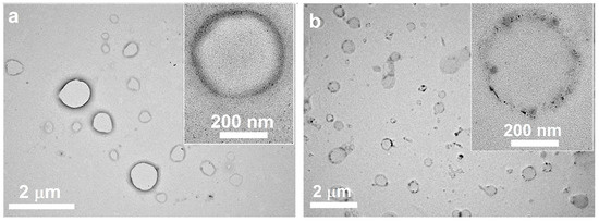 Figure 2. TEM imaging of TMZ-loaded abietic acid (a) and A. sibirica (b) PC/DSPE–PEG2000/Ch lipid nanosystems, CPC = 0.58 μg/mL, mQ water, 25 °C. Scale bar is 2 μm and 200 nm are in insert (a) and (b), respectively.
