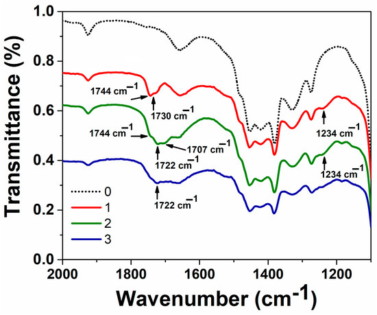 To study the integration into phospholipid bilayer of abietic acid and possible interactions between PC and abietic acid, we used IR spectroscopy. For this purpose, the infrared spectra of PC (1), the mixture of PC and abietic acid (2) and the mixture of PC, abietic acid and TMZ were recorded (Figure 3). A previous work [67] showed the presence of intermolecular interaction between PC and ethanol: thus, in the IR spectrum of PC, the PO stretching band is shifted to 1234 cm−1 compared to the one in the IR spectrum of PC in solid form (1240 cm−1), the C=O stretching band appeared at 1735 cm−1 in solid form. In ethanol, it was split into the main band at 1744 cm−1 and shoulder at 1730 cm−1. In the presence of abietic acid (line 2), the C=O stretching band is shifted to 1722 cm−1. This indicates the possibility of interactions with the carbonyl groups. The addition of TMZ to the mixture of PC and abietic acid showed a change at the same band and a shift from 1744 cm−1 to 1722 cm−1 (line 3). This confirms the interaction between polar groups of PC and abietic acid through carbonyl groups.