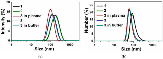 Figure 4. Size distribution using intensity (a) and number (b) parameters of TMZ-loaded lipid nanosystems (1), A. sibirica–lipid nanosystems (2) and TMZ-loaded abietic acid–lipid nanosystems (3), and monitoring the stability in vitro conditions in Tris buffer (10 mM, pH = 7.4) within 24 h and human plasma within 2 h at 37 °C.