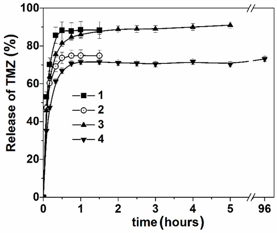 The encapsulation efficiency and loading capacity of TMZ were calculated using Equations (1) and (2) and are presented in Table 1. It is interesting that despite the different membrane structure, the encapsulation efficiency is the same for both systems.
