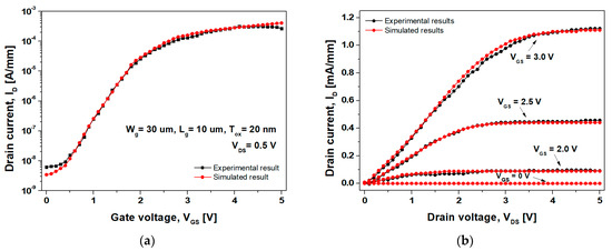 Figure 3a displays the simulated and experimental transfer curves of the inversion mode n-channel GaN SB-MOSFET achieved using the combinations of interface traps listed in Table 2. Figure 3b displays the simulated and experimental output characteristics, which established the validity of the simulation used in this study.