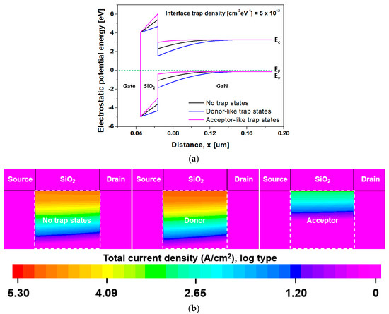 (a) Energy band diagram at the MOS interface along the cutline of X−X’ of Figure 1 under the zero-bias condition; and (b) contour map of the total current density at a VGS of 4.0 V and VDS of 1.0 V according to the type of trap state at the SiO2/GaN interface.