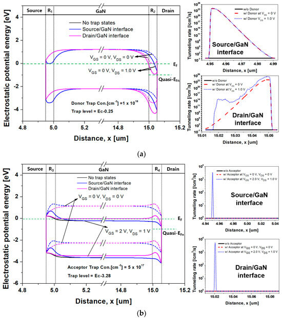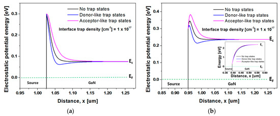 As displayed in Figure 6a, the Ioff for the GaN SB-MOSFET without trap states was 2.6 × 10−21 A/mm, although it increased significantly to 2.6 × 10−10 and 3.1 × 10−13 A/mm when the donor-like traps of (Ec−0.06) and (Ec−0.25) associated with the VN were distributed, respectively. This result indicated that a large number of shallow donor-like trap states had already ionized under the zero-bias condition because the (EF−ET) was sufficiently low to ionize most of the trap states, as demonstrated in Equation (1). The positive ionized donor-like traps increased the electric potential of the SiO2/GaN interface and accumulated electrons in the channel. Owing to this high electron concentration in the channel, the depletion regions of both the source and drain ends of the channel were further reduced, resulting in the barrier tunneling, as indicated in Figure 5a.