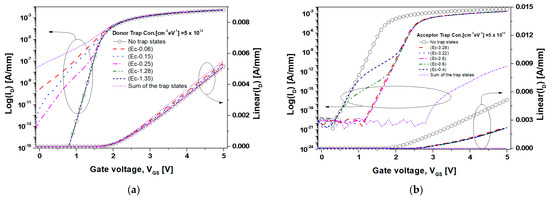 Transfer ID−VGS characteristics of the inversion mode n-channel GaN SB-MOSFET at a VDS of 1.0 V according to the trap state levels: (a) donor- and (b) acceptor-like trap states were defined at the SiO2/GaN interface.
