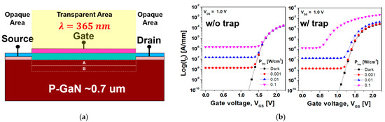 Figure 10 displays the availability of the GaN SB-MOSFET as a phototransistor and the effect of the photo response characteristics according to the type of the trap state. In this simulation study, a GaN SB-MOSFET composed of a transparent top gate and an opaque source/drain was employed, as displayed in Figure 10a. The traps were distributed at the SiO2/GaN interface and the bulk GaN area, and the concentration of the donor- and acceptor-like trap states was set to 1018 cm−3. The trap energy levels of the donor- and acceptor-like trap state were set to (Ec−3.1) and (Ec−3.28), respectively. Areas A and B refer to areas near the SiO2/GaN interface and slightly away from the SiO2/GaN interface, respectively. Figure 10b displays the photo-induced transfer characteristics of the GaN SB-MOSFET with and without the donor-like trap states at incident power densities (Pinc) ranging from 0.001 to 0.1 W/cm2. Under UV irradiation, the conductivity of the channel increased due to the generated electron–hole pairs (EHPs), and this photoconductive (PC) effect resulted in an increase in the Ioff of the GaN SB-MOSFET. The Ioff of the GaN SB-MOSFET without trap states under dark conditions was 2.5 × 10−21 A/mm, which increased to 1.4 × 10−8, 1.3 × 10−7, and 1.3 × 10−6 A/mm for Pinc values of 0.001, 0.01, and 0.1 W/cm2, respectively, during UV irradiation.