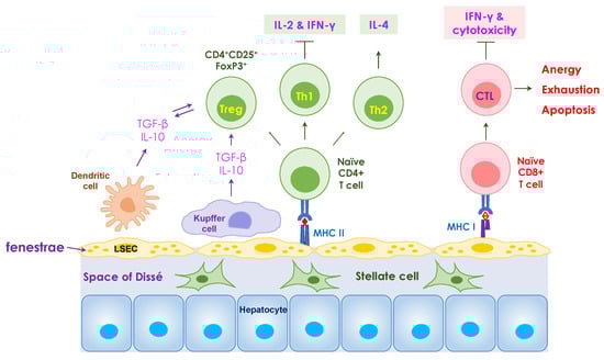 Mechanisms of tolerance mediated in the liver. Liver sinusoidal endothelial cells (LSECs) play a critical role in hepatic immune surveillance by clearing antigens in the blood. The fenestrae of LSECs allow the penetration of nutrient or antigen molecules into the subendothelial space of Dissé. Antigen presentation by LSECs to naïve CD8+ T cells results in the development of dysfunctional cytotoxic T lymphocytes (CTLs) to induce cytotoxicity, including anergy, exhaustion, and apoptosis. The interaction between LSECs and naïve CD4+ T cells induces the differentiation of naïve T cells towards Th2 and regulatory T (Treg) cell phenotypes and suppresses cytokine production by Th1 cells. Kupffer cells, in conjunction with LSECs, secret IL-10 and TGF-β, provide a tolerogenic microenvironment locally in the liver. The resident liver dendritic cells also produce IL-10 and TGF-β and play an important role in tolerance induction.