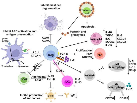 Immunosuppressive mechanisms of regulatory T cells. Regulatory T cells (Tregs) are a subset of CD4+ T cells that modulate the immune system and prevent allergies and autoimmune diseases. They suppress the activity of various immune cells and maintain immune homeostasis through direct and indirect mechanisms. Indirectly, Tregs can secrete anti-inflammatory cytokines, such as IL-10, IL-35, and TGF-β, to inhibit the activation and proliferation of T-effector cells and NK cells. They can also release perforin and granzyme to induce cell death, i.e., apoptosis, by creating pores in the target cell membrane and activating caspases. In addition, Tregs can suppress immune cells by interacting with them directly. For example, Treg cells express high levels of CD25, which is the IL-2 receptor, to sequester IL-2 from the microenvironment, reducing the growth and function of T-effector cells and NK cells. Tregs can also affect NK cells directly by presenting membrane-bound TGF-β to them. Moreover, Treg cells can modulate B cells and dendritic cells by engaging with PDL1/PD-1 and CTLA-4/LAG-3 pathways, respectively. CTLA-4 can also block co-stimulation by reducing CD80/CD86 expression on dendritic cells and induce the upregulation of IDO, which degrades tryptophan and inhibits T-cell proliferation. Additionally, Tregs can express CD39, which converts ATP to adenosine and AMP and reduces T-effector-cell proliferation. Furthermore, Treg cells can skew monocyte differentiation toward anti-inflammatory M2 macrophages and prevent them from becoming pro-inflammatory M1 macrophages. Similarly, Treg cells can induce a suppressive phenotype in neutrophils and reduce ILC2 cytokine secretion. Tregs can make direct contact with mast cells and basophils through OX40/OX40L interaction, modulate their phenotype and activity, and inhibit the release of histamine and IgE production.