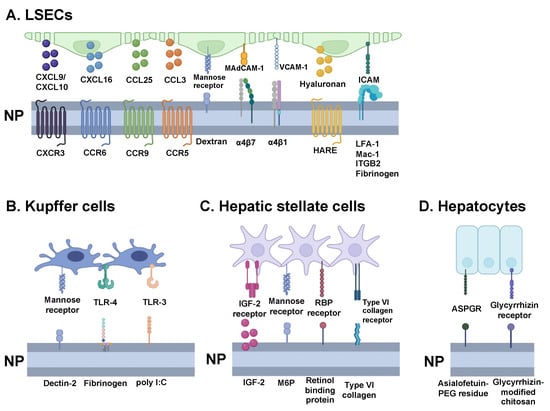 Harnessing ligand-receptor interactions for nanoparticle design. Overview of key ligands that can guide nanoparticles towards the different tolerogenic hepatic cells—(A) liver sinusoidal endothelial cells (LSECs), (B) Kupffer cells, (C) hepatic stellate cells, and (D) hepatocytes. By engineering nanoparticles with ligand receptors, they can more efficiently navigate toward the targeted cells to enhance tolerance induction efficacy. CXCL = C-X-C motif chemokine ligand; CXCR = C-X-C motif chemokine receptor; CCL = C-C motif chemokine ligand. CCR = C-C motif chemokine receptor; MAdCAM-1 = mucosal addressin cell adhesion molecule 1; VCAM = vascular cell adhesion protein; HARE = hyaluronan receptor for endocytosis; ICAM = intercellular adhesion molecule; LFA-1 = lymphocyte function-associated antigen 1; Mac-1 = macrophage-1 antigen; ITGB2 = integrin subunit beta 2; TLR = toll-like receptor; LPS = lipopolysaccharide; IGF = insulin-like growth factor; RBP = retinol-binding protein; ASPGR = asialoglycoprotein receptor; PEG = polyethylene glycol.