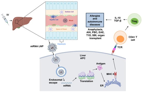 Schematic of mRNA LNP platform. Lipid nanoparticles (LNPs) are formulated by ionizable cationic lipids (e.g., MC3), helper lipids (e.g., DSPC and cholesterol), and PEG-lipids enveloping mRNA molecules and creating inverted micellar structures that protect mRNA from degradation and deliver mRNA to the cytosols for translation. After intravenous injection, the mRNA LNPs travel to the liver sinusoid through the hepatic artery and are taken up by residential antigen-presenting cells (APCs); then, the mRNA is released through endosomal escape and translated by ribosomes, synthesizing proteins as antigens. These antigens are presented to the cell surface after post-translational processing in the endoplasmic reticulum to generate epitopes that are loaded onto MHC-II molecules and presented on the APC surface. Naïve T cells recognize the epitopes binding to the MHC-II molecule and differentiate into regulatory T cells (Tregs) that express FoxP3 and checkpoint proteins (PD-1, PD-L1, CTLA-4, LAG-3, OX40, etc.) and secrete immunosuppressive cytokines, such as TGF-β and IL-10, etc. Tregs can induce immune tolerance and have the potential to treat allergies and autoimmune diseases, such as autoimmune hepatitis (AIH), primary biliary cholangitis (PBC), experimental autoimmune encephalomyelitis (EAE), type I diabetes (T1D), small bowel infarction (SBI), and solid organ transplant.