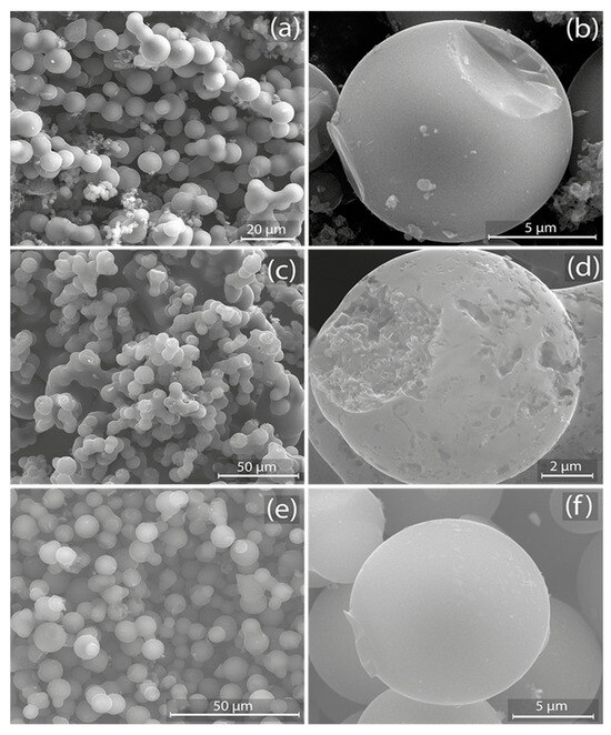 Figure 3e,f show the analysis of the 5:1@120 sample, which manifest even more pronounced alterations. Figure 3e delivers a broader perspective of the spherical structure and underscores considerable signs of wear and tear, almost akin to erosion. Meanwhile, Figure 3f offers a closer view of the sample surface, and the diminished image contrast signifies a more porous and less dense structure. The pronounced jaggedness and irregularities, evident at this magnification, suggest significant changes in the structural composition of the sample, likely due to the longer activation time.