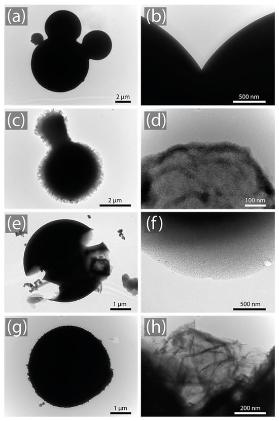 Figure 3e,f delve into the intricacies of the 5:1@120 sample, revealing more striking modifications. Figure 3e provides an expansive view of the spherical form, highlighting evident signs of degradation reminiscent of erosion. In contrast, Figure 3f zooms in on the sample surface. The notable reduction in image contrast indicates a structure that is both more porous and less dense. The manifest jaggedness and irregularities at this magnification allude to considerable shifts in the sample surface morphology, potentially attributable to extended activation times. Figure 3g,h analyze the 5:1@210 sample, particularly, Figure 3g portrays a relatively smooth and rounded structure, while Figure 3h, taken at a finer scale, unveils a complex, folded, and layered structure, reminiscent of a graphitized material.
