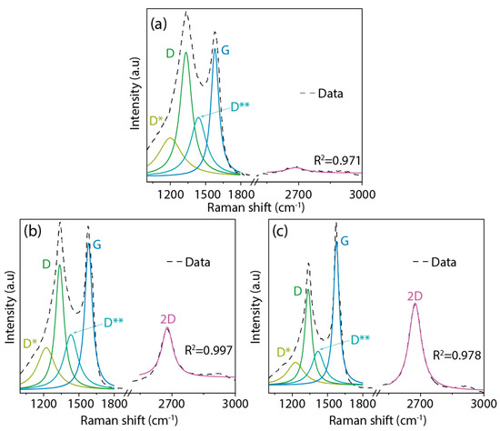 Based on our prior work [43], the D band appears due to the presence of disordered structures within the carbon material and any defects in its graphitic-like structure. This band primarily indicates sp3 hybridized carbon atoms and irregularities within the carbon lattice structure. The G band, on the other hand, suggests graphitic-like configurations. This G band arises due to the E2g phonon of sp2 hybridized carbon atoms in a two-dimensional hexagonal lattice, underscoring the graphitized nature of the obtained material. The D** band owes its presence to various factors, including the phonon density in finite-sized graphitic crystals, C–H vibrations in hydrogenated carbon, and hopping-like defects [44]. While the D* band is indicative of the sp3 diamond-like configuration on disordered amorphous carbons, we point out that the expansive region between approximately 1400 cm−1 and 1650 cm−1 does not correspond to diamond carbon phases [45]. Lastly, the 2D band, being the second harmonic of the D peak, is typically representative of few-layer graphene-like structures (Figure 4c), a fact further substantiated via our TEM findings (see Figure 3h).