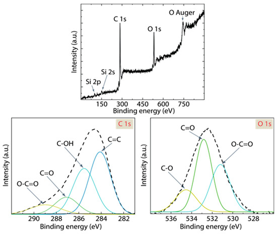 X-ray photoelectron spectroscopy (XPS) provides in-depth insight into the elemental composition, chemical state, and electronic state of the elements present in a material [46]. From Figure 5 and Table 3, a detailed understanding of the surface chemistry of the 5:1@120 AC sample can be extrapolated. The other two samples (i.e., 4:1@120 and 5:1@210) show similar trends, not shown here. In Figure 5a, the broad XPS spectrum displays prominent peaks attributed to C 1s, O 1s, Si 2s, and Si 2p. The clear presence of these peaks confirms the existence of carbon, oxygen, and silicon (from the substrate) on the AC material. Notably, the C 1s and O 1s peaks are of significant intensity, emphasizing their predominant role in the sample chemistry. An additional feature worth mentioning is the “O Auger” peak, representing an Auger electron transition specific to oxygen, reinforcing the presence of oxygen-containing functional groups.