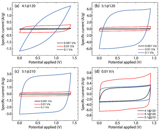 Figure 6 displays the CV test at different scan rates (0.001 V/s, 0.01 V/s, and 0.1 V/s) for the as-made AC samples: 4:1@120 (Figure 6a), 5:1@120 (Figure 6b), and 5:1@210 (Figure 6c). The CV curves of supercapacitors using 5:1@120 and 5:1@210 electrodes show a nearly rectangular shape at lower scan rates (0.001 V/s and 0.01 V/s), suggesting ideal capacitive behavior with low equivalent series resistance (ESR) [34]. This indicates efficient ion transport and charge storage mechanisms within the electrode porous structure. Instead, the supercapacitor with 4:1@120 electrodes shows a departure from the rectangular shape at a lower scan rate (0.005 V/s), indicating a higher ESR, which could be due to less optimal material properties, such as lower graphitization levels, as observed in Raman results (see Figure 4a).