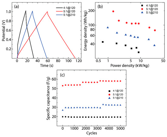 (a) Galvanostatic cycles, (b) Ragone plots, and (c) durability measurements for the three different samples: 4:1@120 (black curve), 5:1@120 (blue curve), and 5:1@210 (red curve). The durability test is carried out at a specific current of 1 A/g.