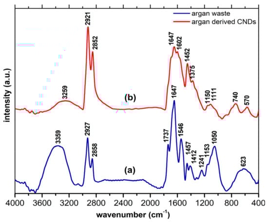 FTIR analysis was performed for both the argan cake waste precursor and the vacuum-dried CND powders obtained upon thermal processing and cooling in water as a dispersion medium (Figure 2a,b). As seen, the precursor presents a wide signal located between 3359–3259 cm−1, related to the bending and stretching vibrations of -OH bonds and attributed to hydroxyl groups and intercalated water []. As expected, the contribution of this signal decreased significantly upon the thermal treatment of the precursor to render the CNDs. The bands at 2927/2858 cm−1, characteristic of the stretching vibrations of C-H in sp3 bonds, were detected in both samples, although they were slightly displaced to lower wavenumbers (2921/2852 cm−1) in the CNDs, suggesting some re-arrangements of the carbon within the graphitic core. The presence of various types of fatty acids in the argan waste is highlighted by the bands related to carbonyl groups (1737–1647 cm−1). The precursor also displayed a band located at 1546 cm−1 associated to N-O stretching. Both former bands are less evident for the CNDs. The 1457 cm−1 (-C-H bending) low-intensity peak is slightly down shifted at 1452 cm−1 in the case of CNDs. The low-intensity bands located at 1241 and 1153 cm−1 are attributed to -C-N and -C-O stretching vibrations, and they are observed in both samples. The band associated with the C=C stretching vibrations of hybridized sp2 carbons (~1580–1602 cm−1) and the band located at 740 cm−1 associated to the -C=C- bending vibrations were only observed for the CNDs; this confirms the aromatization of the carbon matrix during the thermal treatment.