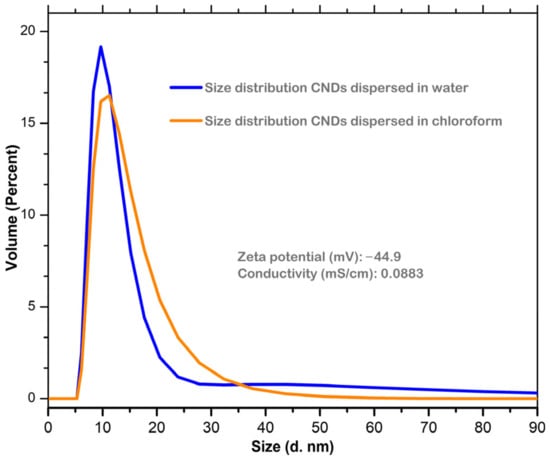 Dynamic light scattering (DLS) was employed to analyze the particle size of the CNDs dispersed in water and chloroform (Figure 3). As seen, the average hydrodynamic diameter of the CND particles dispersed in water is mostly located within the 6–21 nm range, with the largest fraction (19.17%) at 10 nm. On the other hand, the CND particles dispersed in chloroform displayed a narrower distribution of particle sizes, with the average hydrodynamic diameter in the 6–32 nm range, and the largest fraction (58.3%) within the 9–13 nm range. Furthermore, the zeta potential recorded for the CNDs dispersed in water is −44.9 mV, which indicates a moderate to good stability of the dispersion. The narrower size distribution recorded for chloroform-dispersed CNDs indicates the lower agglomeration tendency of the CNDs in this solvent, compared to water. This is attributed to polar surface moieties present in the CNDs, as inferred by the XPS and FTIR analysis. The average particle size is in rather good agreement with the particle size analysis obtained from SEM/TEM images (see below).