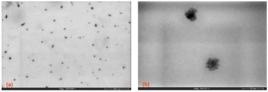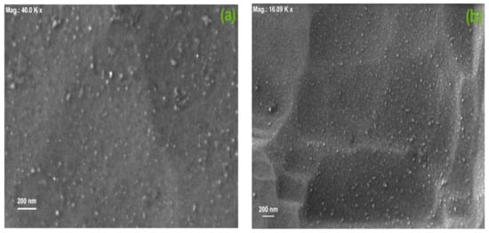 High-resolution SEM micrographs of the CNDs dispersed in water and in chloroform are presented in Figure 4a,b, respectively. Average particle sizes of 25–30 nm were observed for the sample dispersed in water, with some higher-dimension clusters (70–80 nm) clearly visible. This wider distribution of particle sizes is due to the agglomeration tendency in water. For the CNDs dispersed in chloroform, the particle size distribution is markedly lower, with an average size within 15–25 nm and less observation of bigger clusters.