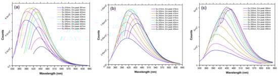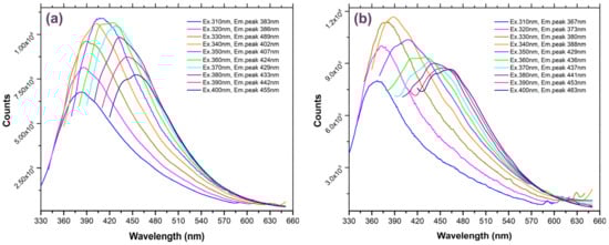 Figure 8a,b displays the emission spectra recorded for the CNDs immobilized in the different polymers: COC/CND and PSA/CND nanocomposites, recorded within the same 310–400 nm excitation range. It should be noted that both nanocomposites presented an intense PL emission (ca. 2 times more intense than that of the CNDs dispersed in water and 3–4 times compared with CND–CLF/THF dispersions). According to our tests, the PL emission remained unchanged and stable for several months (tested over four months).