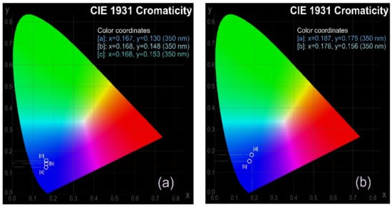 Figure 9a,b shows a comparison of the chromatic parameters (according to the CIE 1931 chromaticity co-ordinates) between the solvent-dispersed CNDs and those of the CND/polymer nanocomposites recorded under 350 nm excitation. As seen, the chromaticity co-ordinates of the immobilized CNDs were slightly shifted to higher luminance (brightness, y co-ordinate) and chromaticity (color, x co-ordinate), thus demonstrating the improved stability of the PL features of the former.