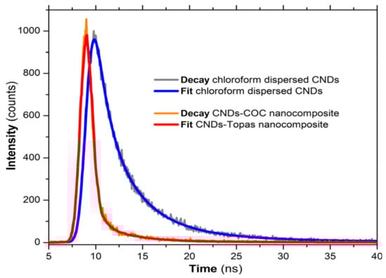 Furthermore, the lifetime of the excited states of the CND/polymer nanocomposites was within the nanosecond range (Table 3), typical values for CNDs as reported in the literature []. It should be noted that the lifetime of the radiative processes for the CND/polymer nanocomposites was lower than that of the dispersed nanostructures (ca. predominant contribution at 1.05 ns). This agrees with the higher PLQY values. Through embedment in the polymer matrix, the excitation energy transferred to the emissive sites within the CNDs and the resulted photon emission become more efficient.