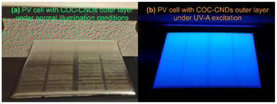 PV cell provided with the COC–CND nanocomposite outer thin layer: (a) under normal illumination conditions and (b) under UV-A excitation.