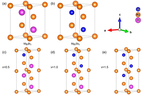 The atomistic structures of the Mg3Bi2−vSbv: the 5-atom unit cell of (a) Mg3Bi2 and (b) Mg3Sb2, and (c–e) the 10-atom cells of Mg3Bi2−vSbv with v in 0.5, 1.0, and 1.5, respectively.
