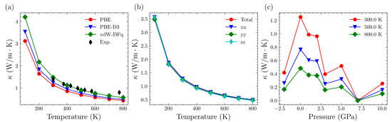 The lattice thermal conductivity of Mg3Sb2 was initially calculated without the application of external pressure. The results, obtained using various vdW corrections and directions, are presented in Figure 2a,b, respectively.