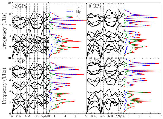 Phonon spectra and phonon density of states of Mg3Sb2 at various pressures.