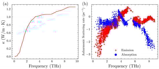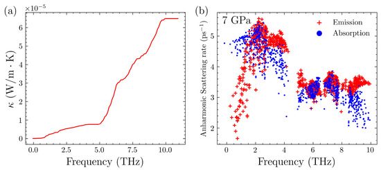 To gain a deeper understanding of the contributions of different phonon modes to lattice thermal conductivity, we plotted the cumulative thermal conductivity as well as the three-phonon scattering rates at 300 K without pressure in Figure 4. The cumulative thermal conductivity is a graph where the horizontal axis represents the vibrational frequency, and it indicates the contribution of phonons with frequencies up to a certain value to the lattice thermal conductivity [73]. Naturally, this should be an increasing curve. For the results at 0 GPa, the curve can be roughly divided into three sections. There is an increasing process below 5 THz with a significant increase from 0 to 3 THz and a relatively smaller increase from 3 THz to 5 THz. Based on the phonon spectrum, these phonons correspond to the acoustic branches and a small fraction of the optical branches. In general, the vast majority of the contribution to thermal conductivity comes from the acoustic branches. In the range of 5–6 THz, the thermal conductivity increases level off. This corresponds to phonon modes with a state density of almost zero, indicating that there is no increase in thermal conductivity in this range. Afterwards, there is a slight increase, suggesting that optical phonons also contribute to the thermal conductivity of Mg3Sb2, increasing it by approximately 20%.