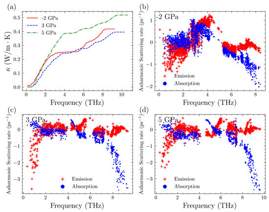 Next, we examined the changes with increased pressure. We plotted these results in Figure 5. In the frequency range of 0–5 THz, both systems under added pressure, whether −2 GPa or 3 GPa, exhibit significantly higher phonon scattering rates compared to the scenario without any added pressure. This also results in significantly lower increases in the lattice thermal conductivity within this frequency range, compared to the scenario without pressure. The comparison of the phonon spectra suggests that the introduction of 3 GPa of pressure results in a gap at the 4 THz position. This causes the thermal conductivity at 3 GPa to enter the flat region earlier. On the other hand, introducing a pressure of −2 GPa significantly increases the scattering rate for phonon emission processes near 4 THz. This, in turn, reduces the contribution of these phonons to thermal conductivity.