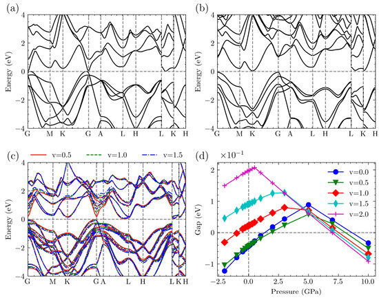 In terms of electronic structure, we utilized the PBE method to calculate the band structures of ternary Mg3Bi2−vSbv. The results obtained without applying pressure are shown in Figure 7. When comparing the band structures for different v values, we can observe that they are initially quite similar. During the transition from Mg3Bi2 to Mg3Sb2, the conduction band gradually shifts upward at the Γ point, eventually reaching a degeneracy with the preceding band. The bandgap also gradually increases. With the exception of the v = 0 and v = 0.5 structures, the other three structures all exhibit indirect bandgaps, with gap widths below 0.2 eV.