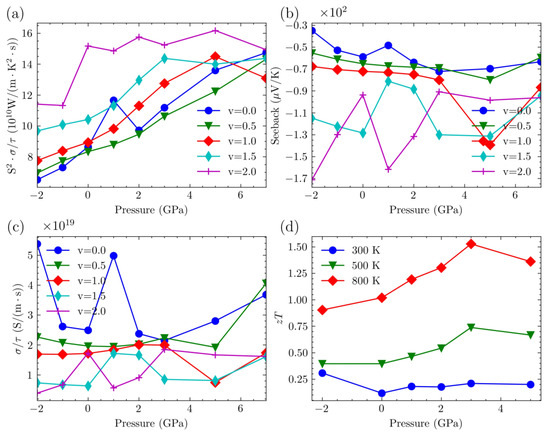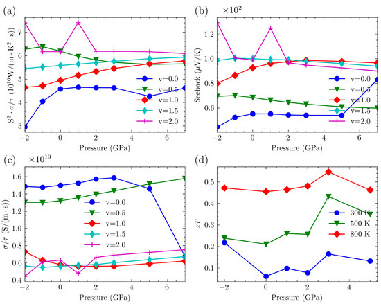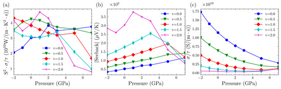 We used TransOpt-v2.0 to calculate the electrical transport properties of the Mg3Bi2−vSbv system. This software can simultaneously output results based on both the CRTA and the CEPCA approaches. When comparing with experimental data, we observed a significant discrepancy. Specifically, the electrical conductivity obtained through the CEPCA was higher by two to three orders of magnitude compared to the experimental results [38]. This discrepancy indicates that considering the electron–phonon coupling matrix as a constant does not accurately represent the electron scattering scenarios in the Mg3Bi2−vSbv system. For the sake of simplicity, we initially disregard the relaxation time. Figure 8 illustrates the changes in the power factor, the absolute value of the Seebeck coefficient, and electrical conductivity as a function of pressure for the Mg3Bi2−vSbv system under n-type doping, while maintaining a constant carrier concentration of 0.03 . Combining the bandgap information from Figure 7d, it is evident that, for the Mg3BiSb (v = 1), Mg3Bi0.5Sb1.5 (v = 1.5), and Mg3Sb2 (v = 2) structures, as per Equations (1) and (2), the bandgap exhibits an initial increase followed by a decrease with pressure. Consequently, there is an initial decrease followed by an increase in electrical conductivity, while the Seebeck coefficient exhibits an initial increase followed by a decrease. This leads to the power factor reaching its maximum value at moderate pressures. However, the observed trend is not as evident for Mg3Bi2 (v = 0) and Mg3Bi1.5Sb0.5 (v = 0.5), which may be attributed to the initially small bandgap, leading to less pronounced changes. Further exploration is necessary to elucidate a more detailed mechanism.