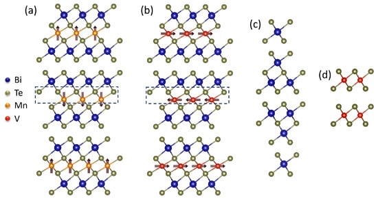 Furthermore, ref. [32] studied the preferred valence states of V, Cr, Mn and Fe in Bi2Te3. In Te-rich conditions, only V and Cr can substitute neutrally for Bi atoms in Bi2Te3. In contrast, Mn and Fe mostly form Mn and Fe, which create energetically unfavourable states when mixed with Bi [9,32]. This additionally shows the unfavourable V valence state. Therefore, Mn and Fe can more easily form a neutral SL structure with respect to V and Cr.