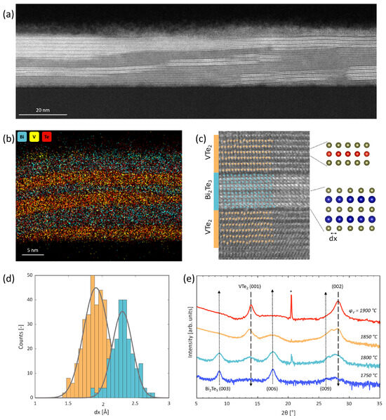 (a) STEM image of a V-Bi-Te sample. The image is taken with a HAADF detector at 300 keV. A clear phase separation between bright and dark areas can be observed. (b) EDX scan of the V-Bi-Te sample. A strong separation between V-regions and Bi-regions can be observed. (c) STEM image of a smaller region on a V-Bi-Te sample. The bright areas (blue) show the QL structure of Bi2Te3 and the dark areas (orange) the VTe structure. (d) Histogram of the atomic distance in the x-direction. (e) 2- scans indicating (00l)-Bi2Te3 being dominant at low , while (00l)-VTe is dominant at high . The arrows indicate the disappearance of the respective phases as a function of . * indicates the Al2O substrate peak.