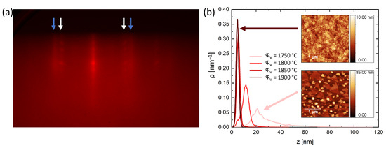 (a) RHEED pattern for = 1750 C showing a double streak pattern related to the phases BiTe with 4.31 Å and VTe with 3.59 Å, indicated by the blue and white arrows, respectively. (b) Height distribution at the surface as a function of the . The insets show the surface morphology of the samples with = 1750 C and = 1900 C.
