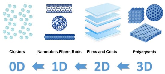 The term “nanotechnology” is frequently used to characterize structures made of tiny pieces that are assembled in bottom-up or top-down ways to form structures as large as hundreds of nanometers [,]. The strictest definition of nanotechnology provided by the National Nanotechnology Initiative relates to structures with at least one dimension of between one and one hundred nanometers []. There are many types of nanomaterials, which can be categorized according to the material matrix: metal-based nanomaterials, carbon-based nanomaterials, nanocomposites, and semiconductor nanomaterials []. Dimensions can be categorized into four categories 0D, 1D, 2D, and 3D (D stands for dimension) as shown in Figure 2 [].