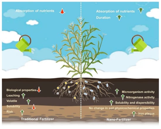 Nano-fertilizers, as an innovative agricultural technology, have multiple advantages when compared with traditional agricultural fertilizers (Figure 5). These include precise control of nutrient release [], improved soil nutrient use efficiency [,], boosted crop output, significantly reduced environmental pollution [] and sustainably released fertilizers, as well as prevention of unwanted interactions between microorganisms [], improved tolerance mechanisms within plants to multiple environmental stresses, enhanced plant metabolism [] and additional advantages for sustainable agriculture when used in combination with microorganisms, etc. []. It is anticipated that the use of nano-fertilizers will significantly affect agricultural productivity globally [].
