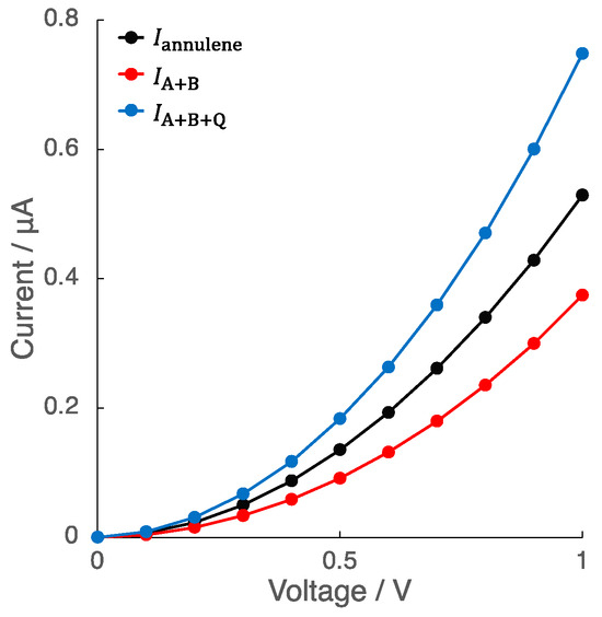 I–V characteristics of the [18]annulene (), the sum of independent polyenes (), and the values including the quantum interference (QI) term ().