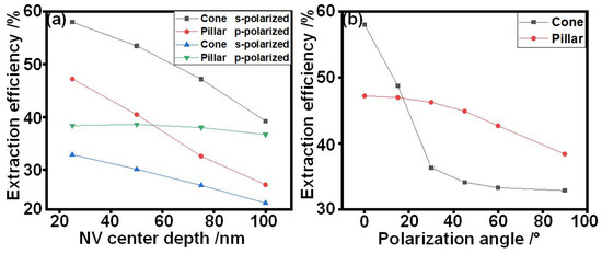 Figure 4 shows the simulation results for the dependence of emitter extraction efficiencies on the emitter’s positions. The photon extraction efficiencies of s− and p−polarized emitters positioned in nanocones and nanopillars at various depths are shown in Figure 4a. Both in the nanocones and nanopillars, the extraction efficiencies of the s−polarized emitters decrease with an increased depth of the emitter. However, the efficiencies of the p−polarized emitters in the nanocones and nanopillars are different. The efficiency decreases with the depth of the emitter in the nanocones, while that remains almost unchanging in the nanopillars.