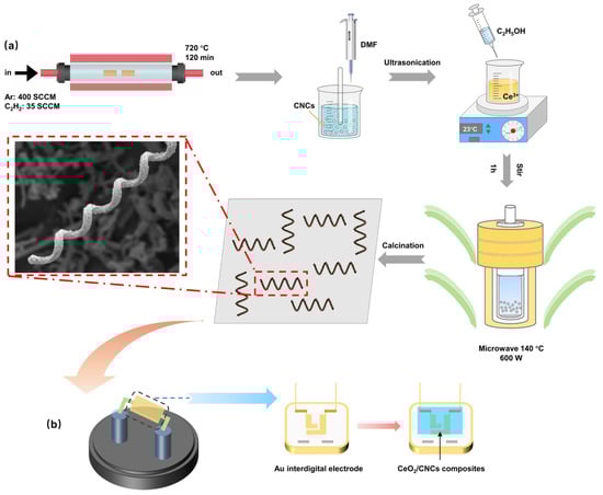 Schematic representation of (a) the synthesis process of CeO2/CNCs nanocomposites; (b) fabrication of gas sensor.