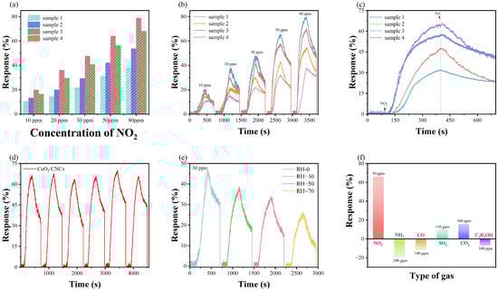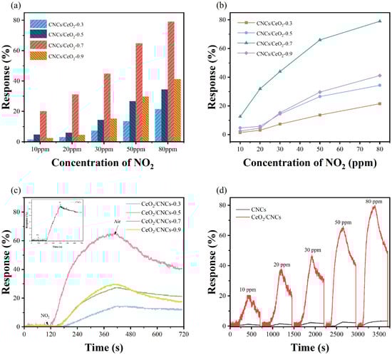 However, the response decreases when the CeO2 content is further increased. The responses of CeO2/CNCs-0.3, CeO2/CNCs-0.5, and CeO2/CNCs-0.9 samples to 50 ppm concentration of NO2 are approximately 14.3%, 27.8%, and 29.3%, respectively (see in Figure 4c). When comparing to above samples, the mass ratio of CeO2/CNCs-0.7 demonstrates superior sensing performance, which exhibits about two to three times greater sensitivity (65.2%) than that of obtained composites. The diminished responsiveness observed in CeO2/CNCs-0.9 compared to CeO2/CNCs-0.7 can be attributed to the heightened crystallinity of CeO2, leading to increased resistance that partially obstructs electron transport within the system, consequently yielding lower response magnitudes. As shown in Figure 4d, the responses of CeO2/CNCs-0.7 and bare CNCs to varying concentrations of NO2 (10–80 ppm) reveal that the sensitivity increases with gas concentration. Furthermore, the CeO2/CNCs composite sample delivers a better sensing performance than bare CNCs. In particular, the response of CeO2/CNCs to 30 ppm (47.3) is nearly ten times higher than the response of bare CNCs (4.69). In fact, pure CNCs display low efficiency in detecting NO2 gas due to its low resistance, which is insufficient to produce significant changes in conductivity. Therefore, the sensing performance can be improved by appropriately increasing the content of CeO2, and highly sensitive CeO2/CNCs-0.7 composites are considered potential sensing materials for the following studies.