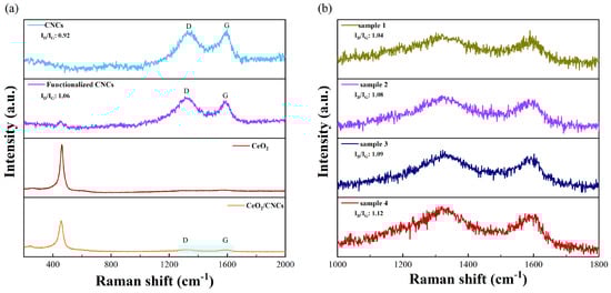 Raman scattering spectra for (a) the CNCs, functionalized CNCs, CeO2 and CeO2/CNCs composites; (b) CeO2/CNCs composites (sample 1, sample 2, sample 3, sample 4) prepared at different temperature.