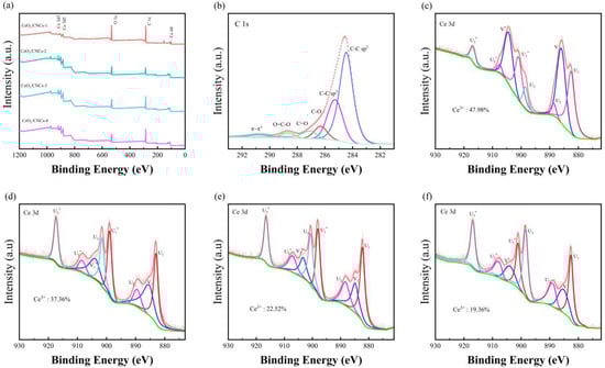 XPS spectra: (a) survey spectra, (b) C 1s and (c–f) Ce 3d of the sample 1, sample 2, sample 3 and sample 4.