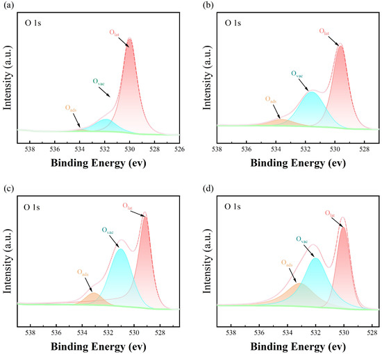 The survey spectrum of the synthesized CeO2/CNCs samples displays a complex structure. The three peak groups correspond to the energy intervals of C, Ce, and O elements, with no peaks indicating the presence of other elements, suggesting a high level of purity in the synthesized material, see in Figure 7a. The high-resolution C 1s spectrum of CeO2/CNCs, as illustrated in Figure 7b, exhibits notable characteristics that are effectively delineated through a fitting utilizing six components. Predominantly featured in the spectrum is a central component positioned at a binding energy of 284.63 eV (BE = 284.63 eV) displaying an asymmetrical profile. This constitution is indicative of the sp2 graphite heterogeneous phase involving carbon-carbon double bonds (C=C) []. Another constituent is situated at higher binding energies relative to the primary peak (BE = 285.1 eV) and displays a symmetrical profile. This particular component is distinctly associated with the C-C phase, characterized by sp3 hybridization of the valence electron states of carbon atoms, which corresponds to the diamond heterostructure under the unique helical structure []. The spectral analysis encompasses various chemical bonding configurations involving oxygen, hydrogen, and carbon resulting from the introduction of numerous functional groups through acidification. These constituents primarily consist of C-O (epoxy and hydroxyl), C=O (carbonyl), and O-C=O (carboxyl) bond categories [,,], each exhibiting binding energies of 286.42 eV, 287.44 eV, and 288.32 eV, respectively. The energy binding peak located at 290.5 eV is assigned to π-π* shakeup satellite. The XPS spectra of Ce 3d in the CeO2/CNCs composites revealed six binding energy peaks (U1, U2, U3, U1*, U2* and U3*) attributed to Ce 3d5/2 and 3d3/2 of Ce4+ ions, as well as V and V* peaks corresponding to Ce 3d5/2 and 3d3/2 of Ce3+ ions, seem in Figure 7c–f. To further investigate the surface oxygen states, the O 1s spectra of the samples were analyzed and divided into three peaks representing Olat (latticeoxygen), Ovac (oxygenvacancies) and Oads (chemisorbed oxygen species), as shown in Figure 8a–d. Olat with the binding energy in the range of 529.2–530.4 eV represents oxygen ions in the crystal lattice, which does not contribute to the gas response. Ovac and Oads, with the binding energies of approximately 531.5 eV and 533.7 eV, play an important role in improving gas sensitivity [,,]. According to the relative area of the fitted peaks, the ratios of cerium and oxygen are listed in Table S1. It is observed that at lower reaction temperatures, the dominant species are Ce3+ ions and lattice oxygen. However, as the synthesis temperature is increased from 100 to 140 °C, the concentration of Ce3+ decreases from 47.98 to 19.38%, while the concentration of Olat decreases from 84.6 to 53.02%. This decrease in Ce3+ ions is attributed to their transformation into Ce4+ under high heat, while the lattice oxygen evolves into oxygen vacancy defects and chemisorbed oxygen. Among these samples, sample 3 synthesized at 140 °C exhibits the highest concentration of Ovac at 35.6%. The concentration of Ovac slightly decreases to 34.69% when the temperature is further increased to 160 °C (sample 4). While tested at 50 ppm, shows a decrease in response degree of 56.4%, which is smaller compared to sample 3 (65.3%) due to electron transfer barriers during the recrystallization of CeO2. These results highlight the significant role of oxygen vacancies and chemisorbed oxygen in gas sensing. Moreover, the content of these components can be adjusted by manipulating the reaction temperature, which in turn enhances the sensing performance.
