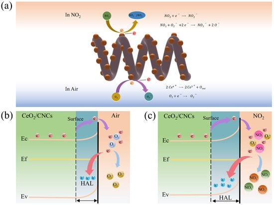 (a) Schematic for the gas-sensing mechanism; The adsorption sensing mechanism on the surface of CeO2/CNCs composites for (b) O2 and (c) NO2.