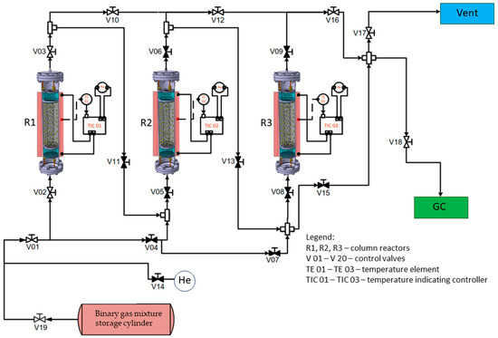 Experimental testing of adsorption capacity, a (cm3/g), was conducted in a three-column reactor system with versatile functionality for independent or parallel use [24], Figure 1. The study focused on the comparative analysis of the different behaviors of the tested nanomaterials, developed by ICSI (Ramnicu Valcea, Romania) (Fe-BTC, UiO-66, Cu-Zn-MCM-41), and commercial materials (Activated Carbon-AC, ZMS-5 and SiO2, all three being purchased from SC UTCHIM SRL, Ramnicu Valcea, Romania). The Fe-BTC, UiO-66, and Cu-Zn-MCM-41 nanomaterials were previously synthesized and characterized by the authors at ICSI (Ramnicu Valcea, Romania) facility [24], while the commercial materials such as Activated Carbon (AC), ZSM-5, and SiO2 were purchased from SC UTCHIM SRL in Ramnicu Valcea, Romania.