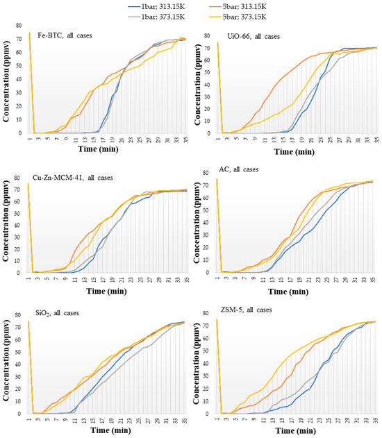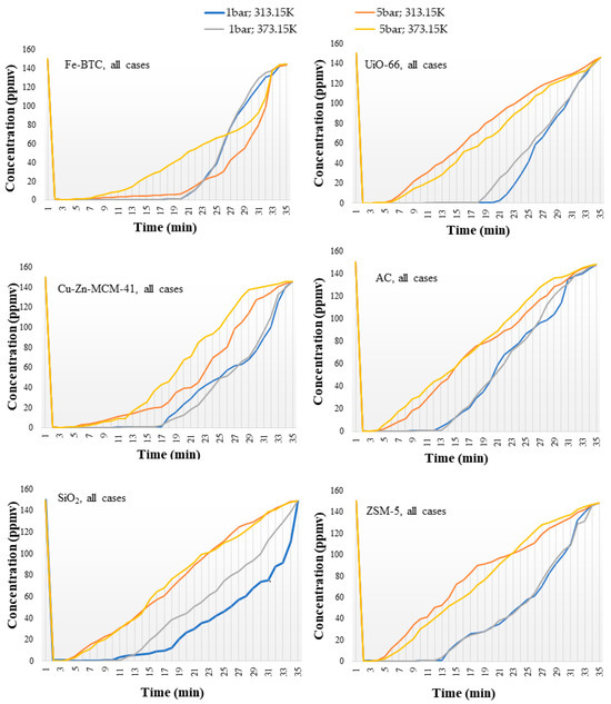 Sulfur dioxide generated by the burning of fossil fuel is a major pollutant, which can generate acid rain and photochemical smog, and many other unwanted environmental and health hazards [51]. Therefore, the capture or separation of SO2 is an important gas treatment process in industry. The investigation technique was similar to the one used for the NO adsorption study, in terms of process time, 35 min, and interval division. As the initial concentration was 75 ppmv, the borders of these intervals were different, more precisely (I) 75 ppmv to the corresponding breakthrough time, <1 ppmv; (II) 1–50 ppmv concentration range and (III) 50 ppmv—final concentration (Cf). The gas chromatography method was used to track the evolution of the SO2 concentration during the testing, as shown in Figure 4.